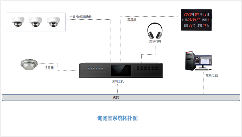 4.詢問室前端部署數(shù)字高清同步錄音錄像主機;特寫攝像機;全景攝像機;時間溫濕度屏;原聲拾音器;受令耳機;壁掛顯示屏等;