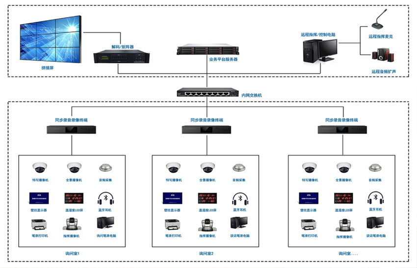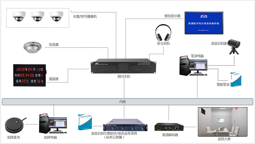 4.系統(tǒng)前端部署數(shù)字高清同步錄音錄像主機(jī);特寫攝像機(jī);全景攝像機(jī);時(shí)間溫濕度屏;原聲拾音器;角色區(qū)分陣列麥克;智能筆錄軟件;筆錄工作站;受令耳機(jī);壁掛顯示屏;打印機(jī);身份證閱讀器、指紋簽名一體機(jī)等;