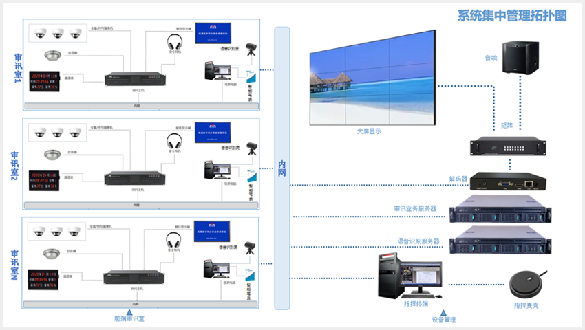 5.后端部署語音識別服務(wù)器;談話業(yè)務(wù)服務(wù)器;指揮工作站;指揮麥克;擴(kuò)聲設(shè)備;有條件的可以部署大屏(拼接屏)等;